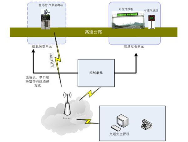 可依托高速公路上已安裝的可變限速標(biāo)志,根據(jù)不同路段檢測的能見距離,實(shí)時(shí)控制各限速標(biāo)志的限速值,這樣系統(tǒng)不但可及時(shí)提醒駕駛員注意前方大霧,還可向駕駛員安全速度。